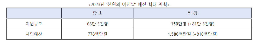 이에 따라 정부는 지난 29일 열린 청년정책조정위원회에서 올해 천원의 아침밥 지원 사업 규모를 대폭 확대해 지원 인원을 68만5000명에서 150만명으로 확대하기로 했다.