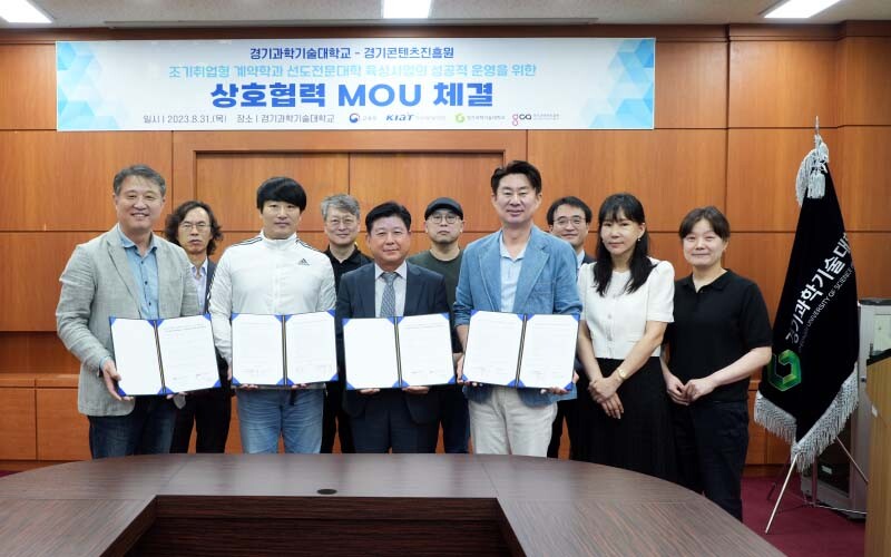 [대학저널 온종림 기자] 경기과학기술대학교와 경기콘텐츠진흥원이 지난달 31일 대학 본관 1층 대회의실에서 조기취업형 계약학과에 대한 공동 협력 추진을 위한 상호협력 MOU를 체결했다.