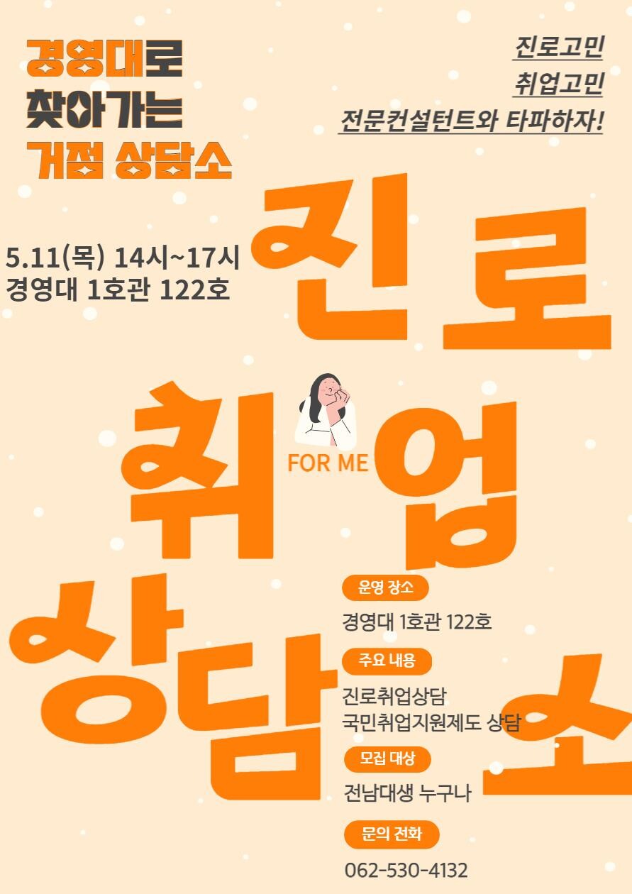 [대학저널 온종림 기자] 전남대가 학생과 지역 청년들에게 진로와 취업, 고용정책을 안내하는 '찾아가는 거점 상담소'가 호응을 얻고 있다.