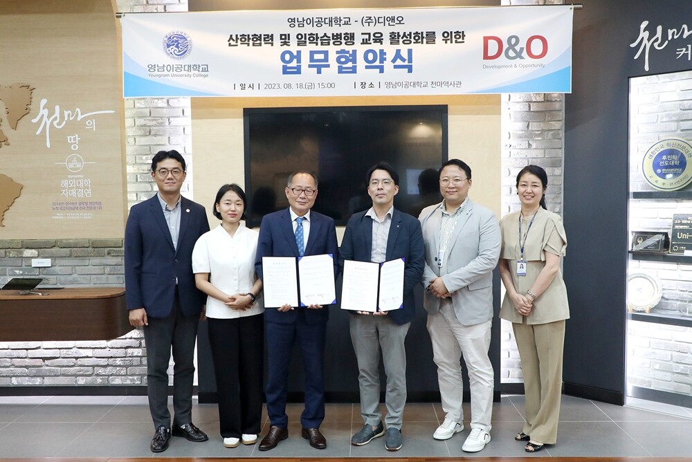 영남이공대가 18일 ㈜디앤오와 일학습병행 교육 활성화를 위한 업무협약을 체결했다. 사진=영남이공대 제공 |