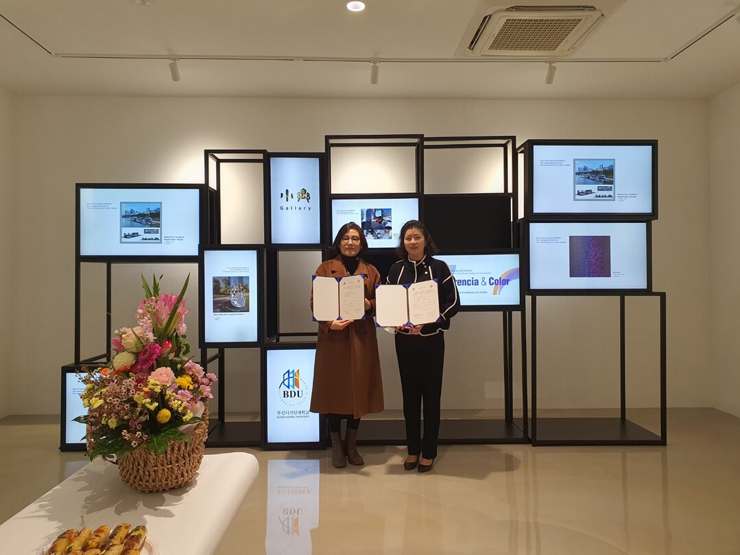 노지화(왼쪽) 한국색채학회 영남지회 지회장과 이주현 부산디지털대학교 시각미디어디자인학과장이 11일 학술교류 협약을 체결한 뒤 협약서를 펼쳐보이고 있다. 사진=부산디지털대 제공