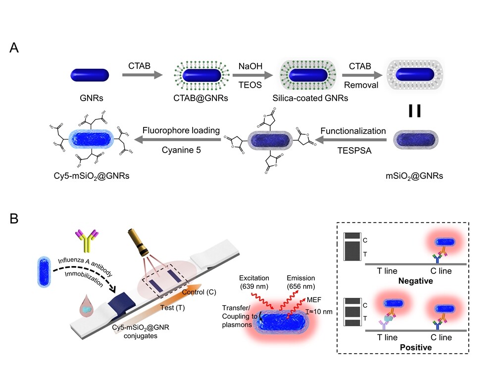 연구팀은 금나노막대와 형광 발광체의 거리를 조절해 형광 신호를 획기적으로 향상시킬 수 있는 최적의 금속증강형광 현상 조건을 찾아 항원진단 기술에 적용해 인플루엔자 바이러스의 검출 정확성을 높였다.