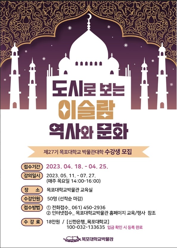 목포대에 따르면 제27기 박물관대학은 '도시로 보는 이슬람 역사와 문화'를 주제로 5월 11일부터 7월 27일까지 매주 목요일 오후 2~4시 박물관 교육실(도림캠퍼스)에서 진행된다.