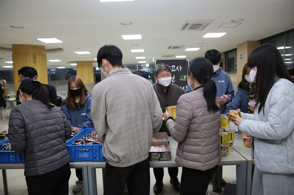 15일 건양대에 따르면 김용하 총장과 주요 보직자들, 총학생회 학생들은 지난 13일 논산에 위치한 창의융합캠퍼스와 14일 대전에 있는 메디컬캠퍼스에서 오후 5~6시 컵라면과 삼각김밥 각각 600개씩 1200개를 학생들에게 나눠줬다.