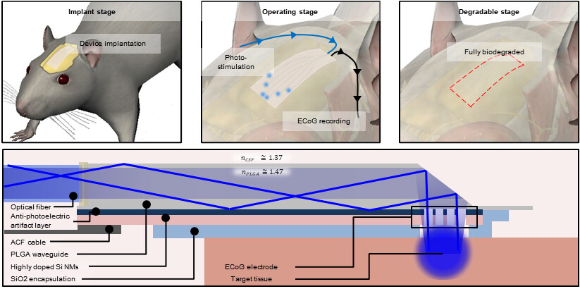 이에 연구진은 세계 최초로 완전 생분해성 다기능 뇌신경 임플란트 광전자 시스템을 개발했다. 새롭게 개발한 생분해성 다기능 광전자 장치는 생분해성 유·무기 물질로만 구성돼 유연하다. 때문에 대뇌 피질에 삽입돼 표적 영역 상에 광 유전학적으로 조작된 신경 세포의 활동을 선택적으로 자극함과 동시에 실시간으로 기록이 가능했다. 또한 장치의 수명이 다하면, 완전히 체내에서 분해돼 흡수됐다. 이 과정은 설치류 모델을 통해 성공적으로 검증했다.