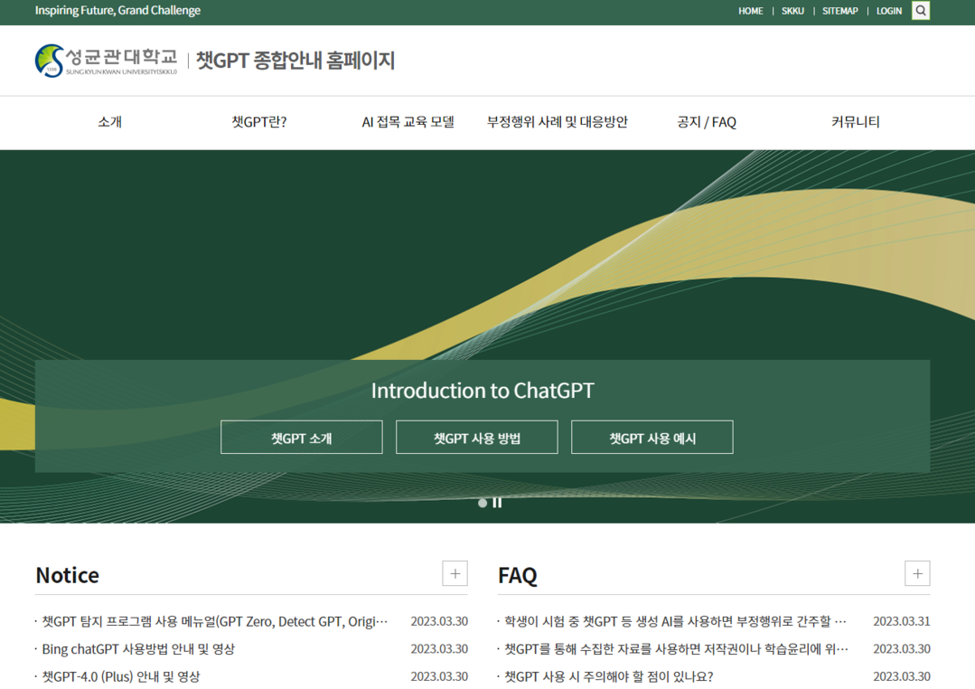10일 성균관대에 따르면 챗GPT 종합안내 플랫폼 홈페이지에서는 챗GPT와 생성형 AI가 무엇인지 알려주고, 최신 정보 동향 및 구체적인 사용방법과 활용 사례를 일목요연하게 제시한다.