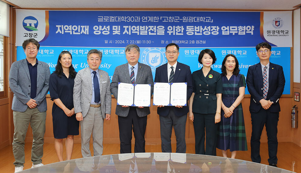 [대학저널 이선용 기자] 원광대학교와 고창군이 7월 22일 원광대 본관 회의실에서 글로컬대학30과 연계한 지역인재 양성 및 지역발전을 위한 업무협약을 체결했다.
