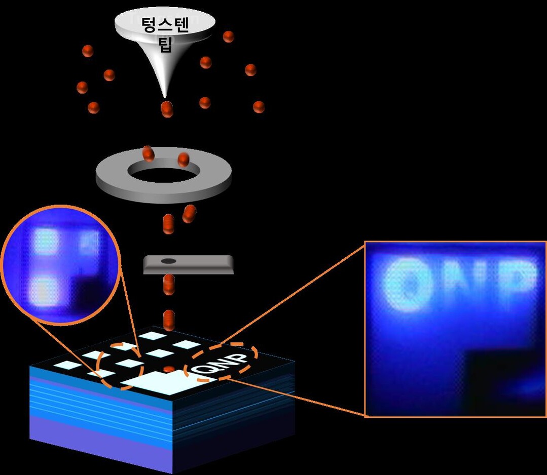 조 교수연구팀은 집속 이온 빔을 이용해 복잡한 전 후 공정 없이도 마이크로 스케일 이하의 크기까지 픽셀을 만들 수 있는 기술을 개발했다. 해당 방법은 집속 이온 빔을 약하게 제어해 물질 표면에 어떤 구조적 변형을 일으키지 않고, 발광하는 픽셀 모양을 자유자재로 설정할 수 있다는 장점이 있다.