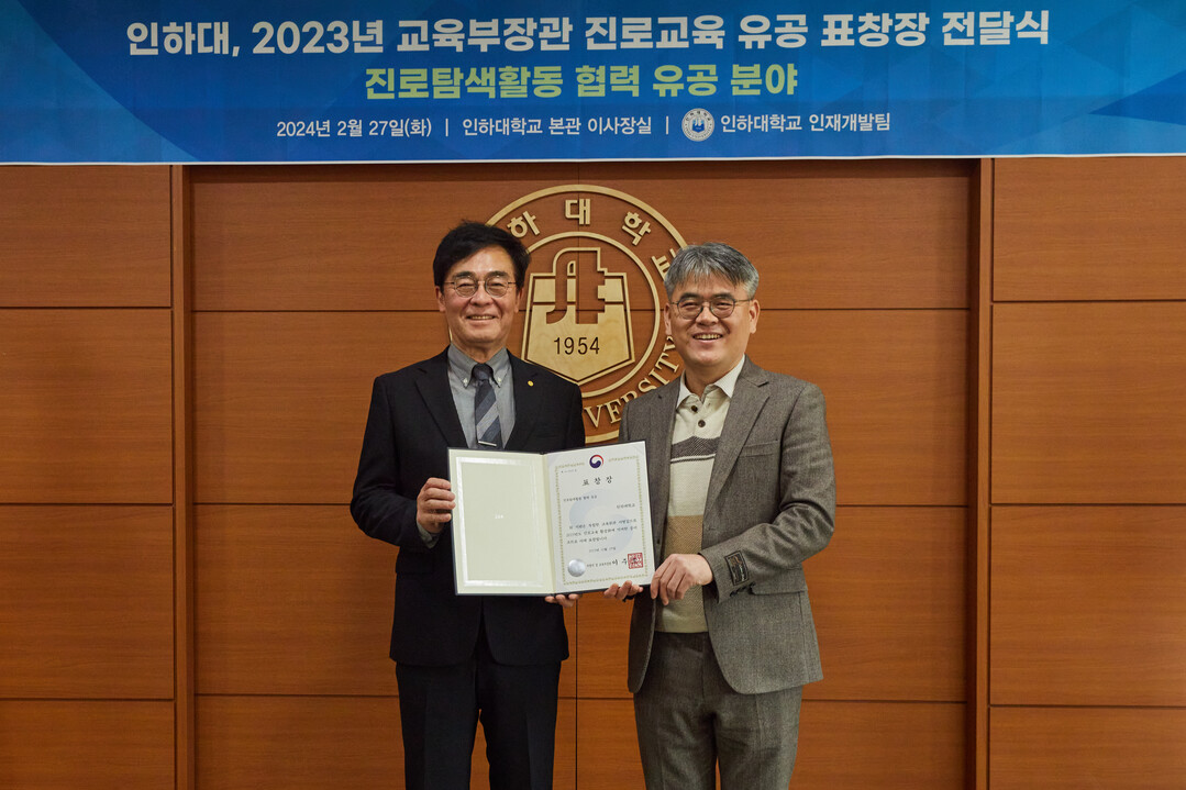 왼쪽부터 조명우 인하대학교 총장과 정태욱 인하대학교 인하인재개발원장이 교육부장관 진로교육 유공 기관 표창 기념사진을 촬영하고 있다. 사진=인하대 제공 |