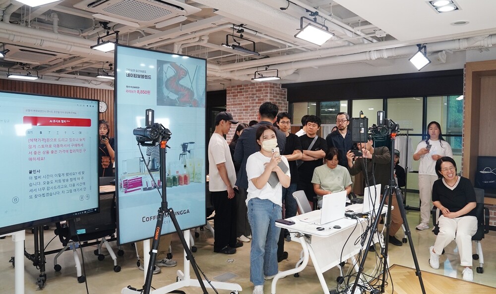 영남이공대가 지난 22일 주최한 '비대면 판로 개척을 위한 전략 워크숍'에서 대구커피협 회원들이 라이브 커머스 시연을 하고 있다. 사진=영남이공대 제공 |