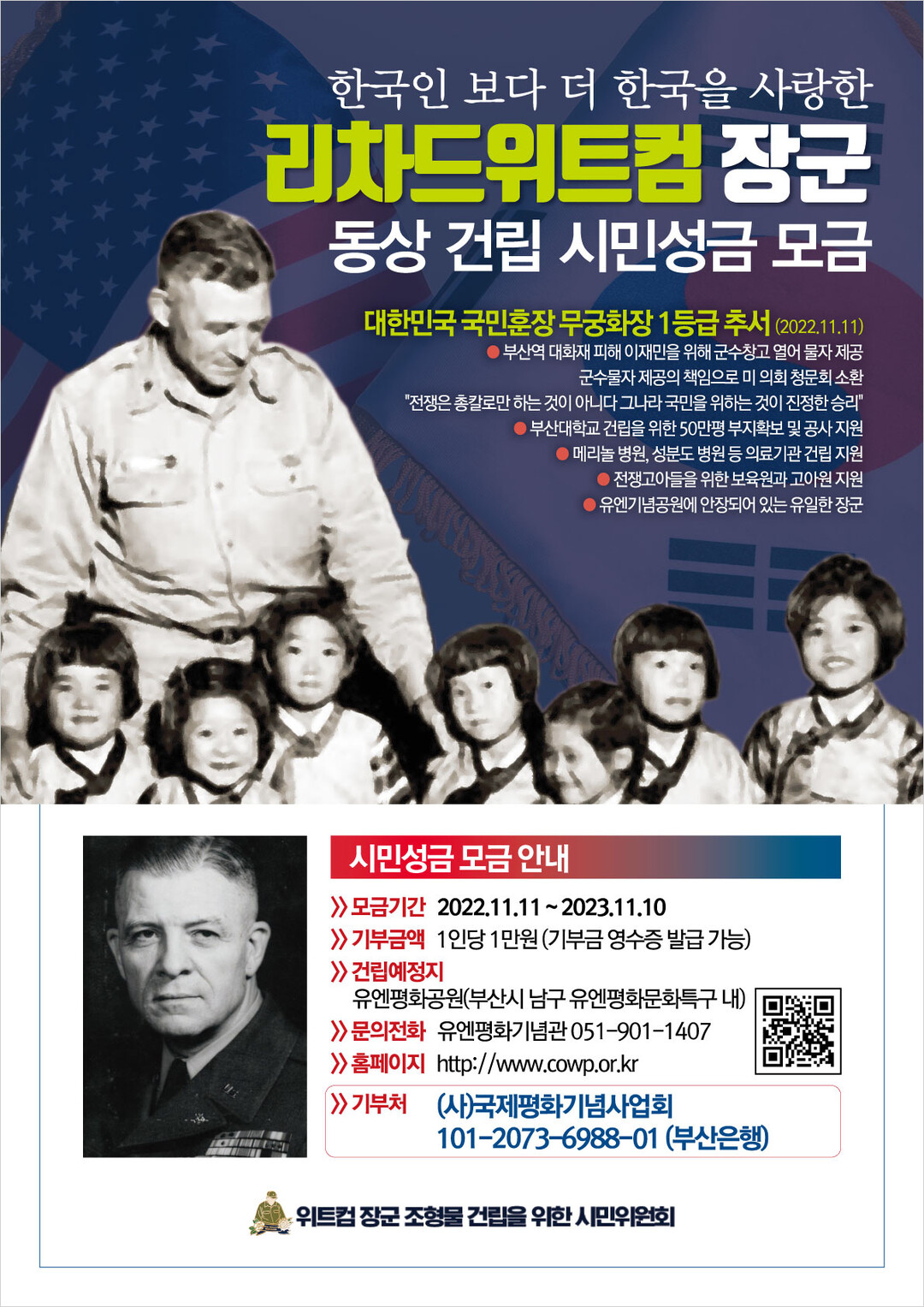 시민위는 지난해 11월부터 올해 11월 10일까지 위트컴 장군 조형물 건립을 위한 시민성금 모금 활동을 한다. 조형물은 부산 평화공원 내에 들어설 예정이다.