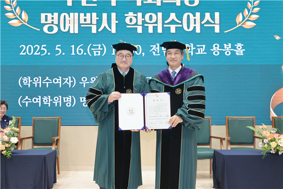 [대학저널 이선용 기자] 전남대학교는 5월 16일 오후 3시 30분, 용봉홀에서 우원식 국회의장에게 명예 철학박사 학위를 수여했다. 이날 행사는 우 의장이 시대적 위기 속에서 헌정질서 수호와 민주주의 실현, 사회적 약자를 위한 실천적 정치에 기여한 공로를 인정해 마련됐다.