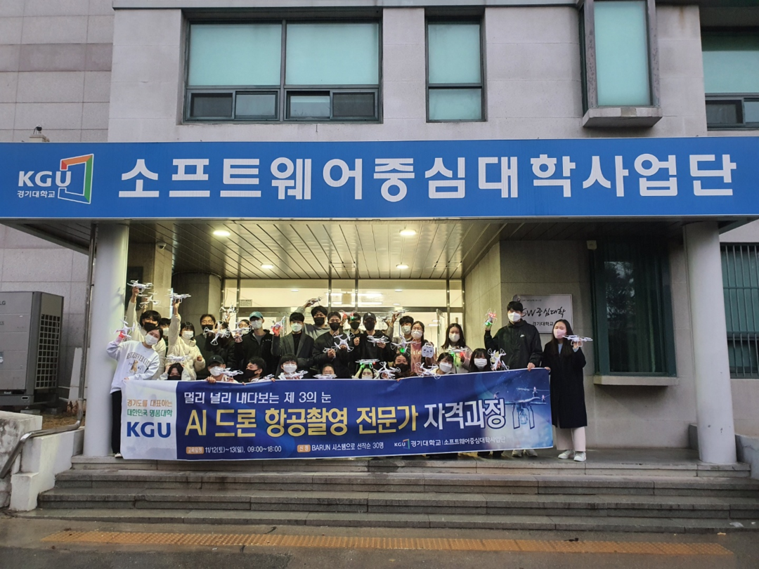 AI 드론 항공촬영 전문가 자격과정을 받고 단체사진을 찍고 있는 경기대 학생들. 사진=경기대 |