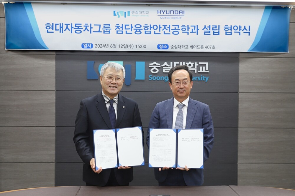 숭실대가 현대자동차그룹과 함께 ‘첨단융합안전공학과’를 설립한다. 지난 12일 숭실대에서 열린 협약식에서 숭실대 장범식 총장(왼쪽)과 현대차그룹 김걸 기획조정실장이 협약서를 들고 기념촬영하고 있다. 사진=숭실대 제공 |