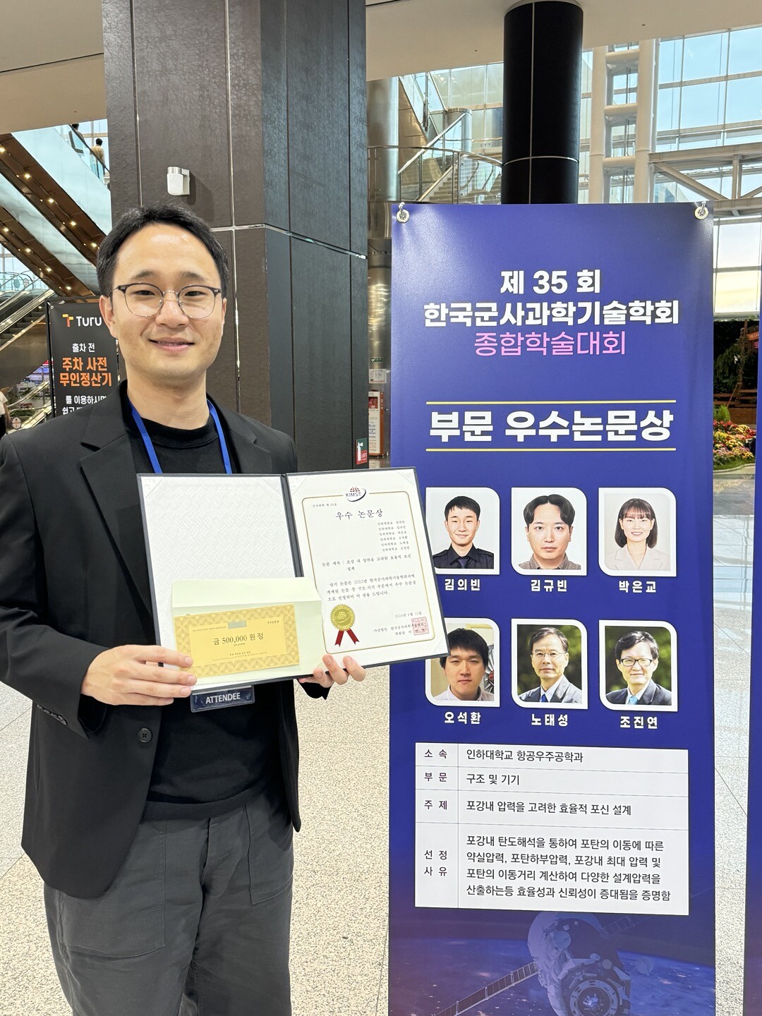 인하대 항공우주공학과 구조연구실과 추진연구실 소속 학생들은 ‘포강 내 압력을 고려한 효율적 포신 설계’(Efficient Design of Gun-Tube Considering Inner Pressure of Bore) 주제의 논문으로 수상했다.