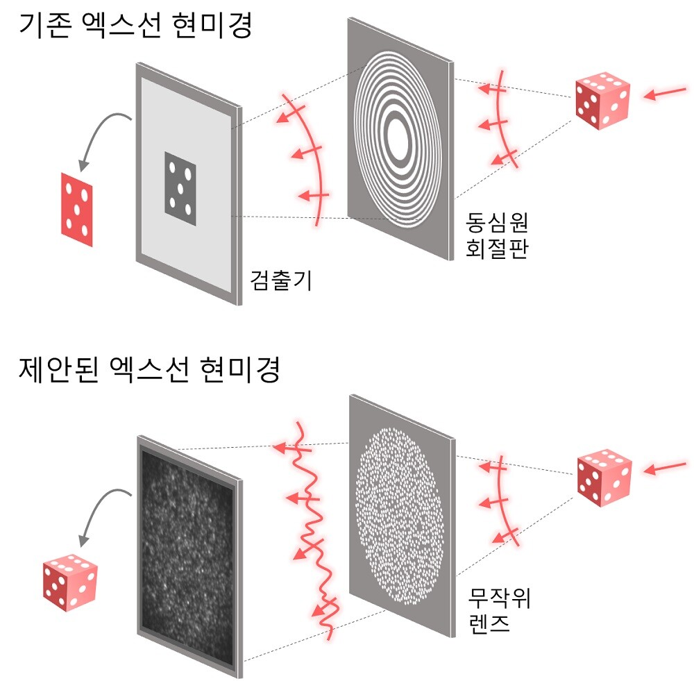 기존 엑스선 현미경(위)와 제안된 엑스선 현미경(아래) 모식도. |