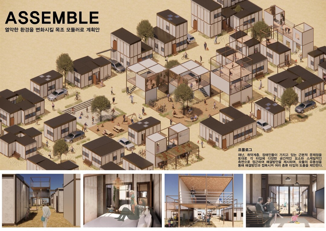 16일 동명대에 따르면 강민규·이유나 학생팀은 건축을 4가지 타입으로 마을을 만들어 사람을 모은다는 의미와 모듈 간 조립으로 여러 타입을 반복적으로 구성한다는 의미로 접근해 모듈의 유동성을 활용해 열악한 주거환경 문제점의 해결 방안을 제안해 상을 받았다.