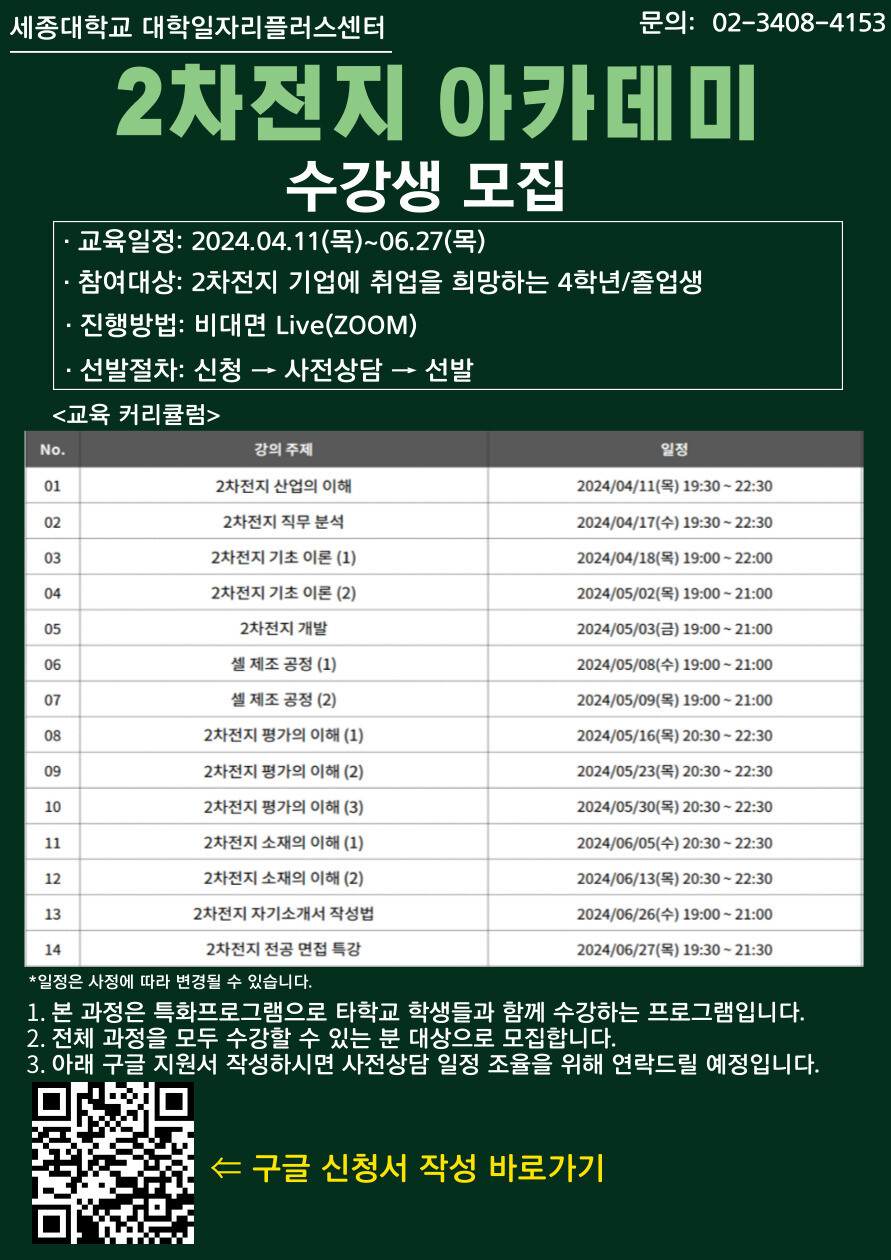 [대학저널 이선용 기자] 세종대학교 대학일자리플러스센터가 거점형 특화프로그램의 일환으로 2024년 상반기 2차전지 아카데미 프로그램을 운영한다.