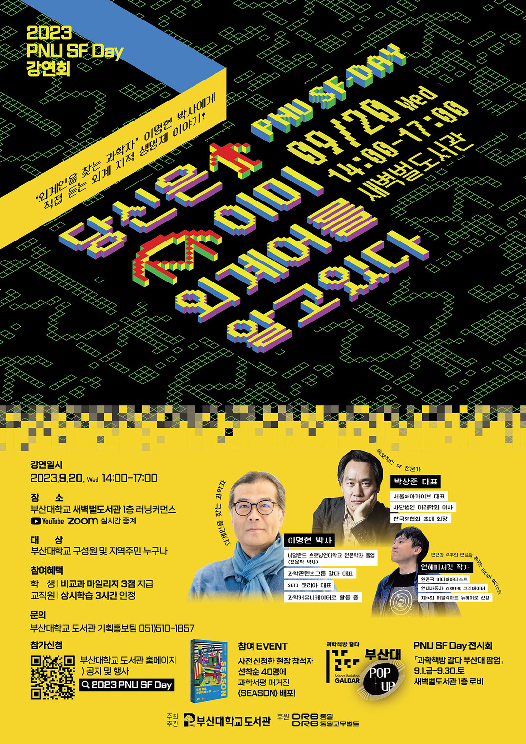 강연회는 오는 20일 오후 2시부터 부산대 새벽벌도서관 1층 러닝커먼스에서 ‘외계 지적 생명체와의 소통’에 대한 내용으로 천문학자 이명현 박사와 서울SF아카이브 박상준 대표, 미디어아티스트 언해피서킷이 강연을 펼친다.
