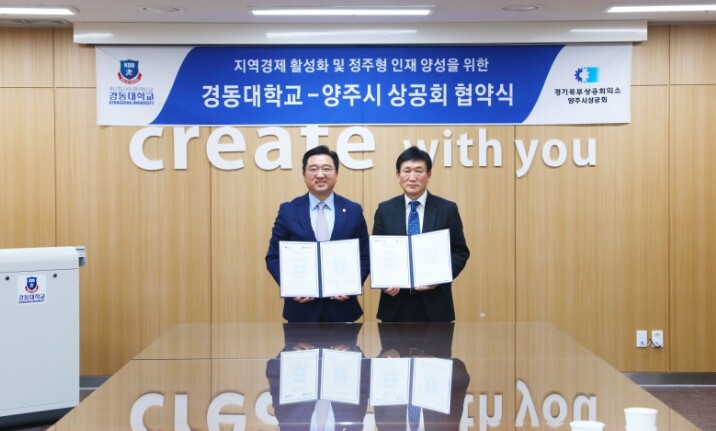 [대학저널 온종림 기자] 경동대학교가 1일 양주 메트로폴캠퍼스에서 양주시 상공회와 ‘지역경제 활성화 및 정주형인재 양성’ 협약을 체결했다. 협약식에는 양주시 상공회 박종서 회장, 신춘자 감사, 이문규 위원장(가구분과), 전길재 부장과 경동대 전성용 총장을 비롯한 부처장 등 모두 10여 명이 참석하였다.