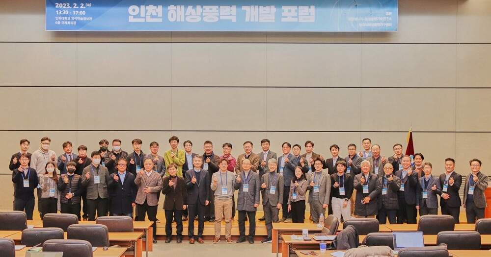 인하대학교 부유식해상풍력연구센터가 주최한 인천 해상풍력 개발 포럼에 참석한 개발사와 인천시, 한국에너지기술평가원 등 관계자들이 기념촬영을 하고 있다. 사진=인하대 제공대학저널 / 온종림 기자 jrohn@dhnews.co.kr |