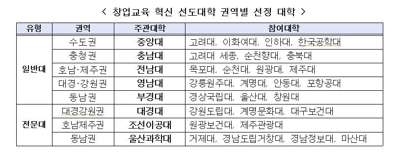교육부는 일반대 연합체 5곳과 전문대 연합체 3곳을 선정됐다. 선정된 일반대 연합체는 ▲ 수도권: 중앙대·고려대·이화여대·인하대·한국공학대 ▲ 충청권: 충남대·고려대 세종·순천향대·충북대 ▲ 호남·제주권: 전남대·목포대·순천대·원광대·제주대 ▲ 대경·강원권: 영남대·강릉원주대·계명대·안동대·포항공대 ▲ 동남권: 부경대·경상국립대·울산대·창원대 등이다.