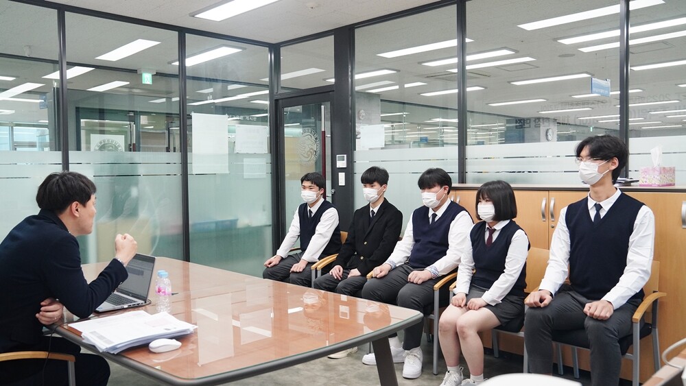 지난 4월 영남이공대 대학일자리플러스센터 회의실에서 스태츠칩팩코리아가 고교생을 대상으로 채용 면접을 진행하는 모습. 사진=영남이공대 제공 |