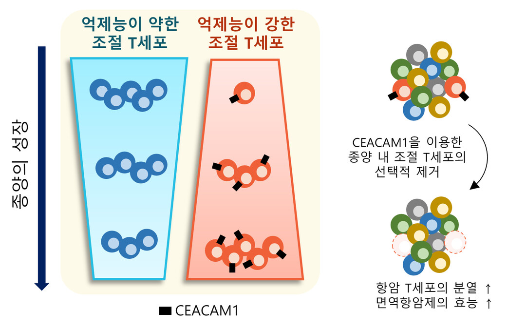이번 연구는 우리 몸에 존재하는 조절 T세포에는 영향을 주지 않으면서 종양 내에 존재하는 조절 T세포를 선택적으로 제거하는 것을 가능케 하는 새로운 표적 단백질인 시캠1(이후 CEACAM1)을 발굴하고, 이를 타겟으로 종양 내 조절 T세포를 선택적으로 제거했을 때, 최근 암 환자에게 널리 쓰이는 기존 면역항암제의 효능을 월등히 증가시킬 수 있음을 증명했다.