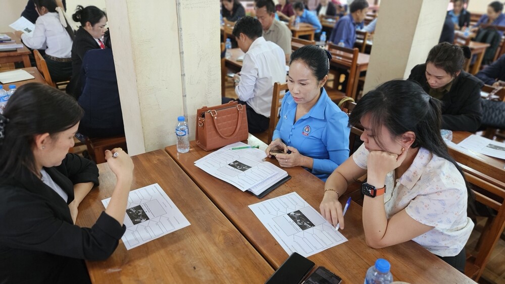 숙명여대 아태여성정보통신원이 라오스 비엔티안 소재 라오스 국립대학교에서 진행한 ‘교직원 역량강화 워크숍’에서 참가자들이 서로 의견을 나누고 있다. 사진=숙명여대 제공 |