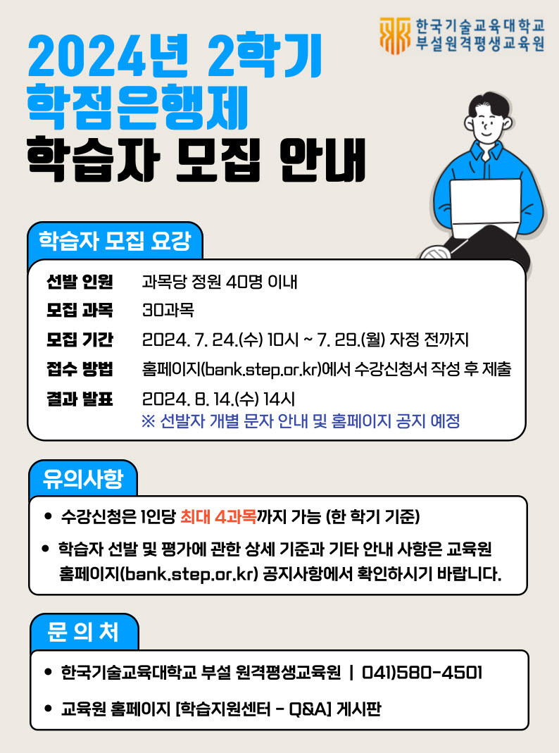 자세한 사항은 한국기술교육대학교 부설 원격평생교육원 홈페이를 통해 확인할 수 있다.