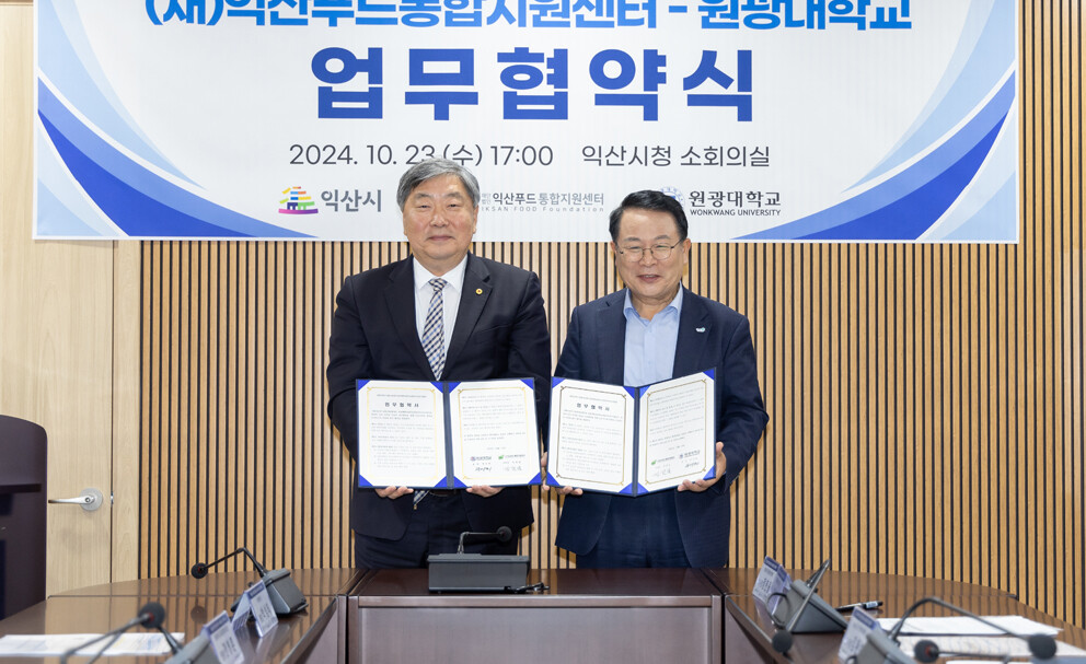 [대학저널 이선용 기자] 원광대학교 글로컬대학사업단과 (재)익산푸드통합지원센터가 지난 10월 23일 익산시청 회의실에서 업무협약을 체결했다.