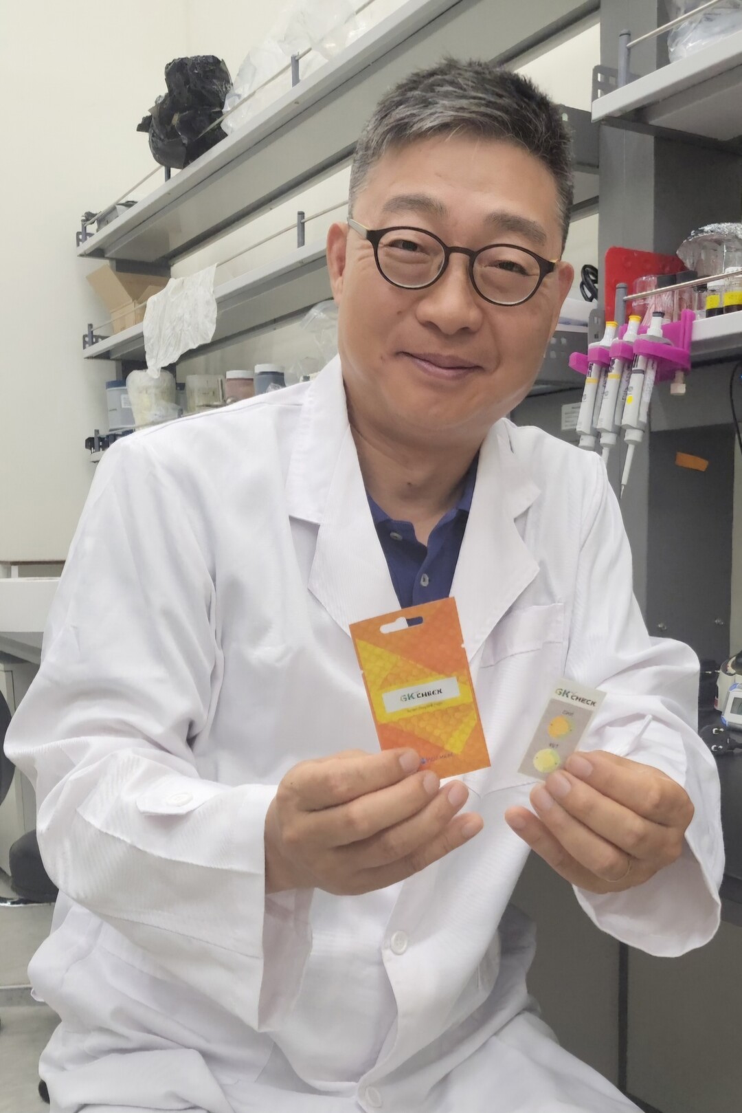 김상효 교수가 최근 개발한 마약 탐지 간이키트 ‘GK-CHECK’를 들고 있다. 사진=가천대 제공 |