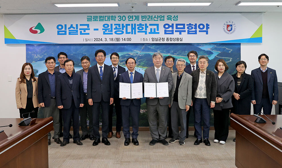 18일 임실군청에서 열린 협약식은 박성태 총장과 심민 군수를 비롯해 임실군에서 이남재 행정문화국장, 김종민 복지환경국장, 손석붕 산업건설국장, 김치환 기획감사실장, 최낙현 관광치즈과장, 황선희 경제교통과장, 원광대에서는 정성태 기획처장, 전병훈 교무처장, 유병남 대외협력홍보처장, 이동기 글로컬소통협력실장, 이미진 동물보건학과장, 이현아 대학혁신사업단 부단장, 유승수 지역혁신연구원 연구교수가 참여해 상호 협력 방안을 논의했다.