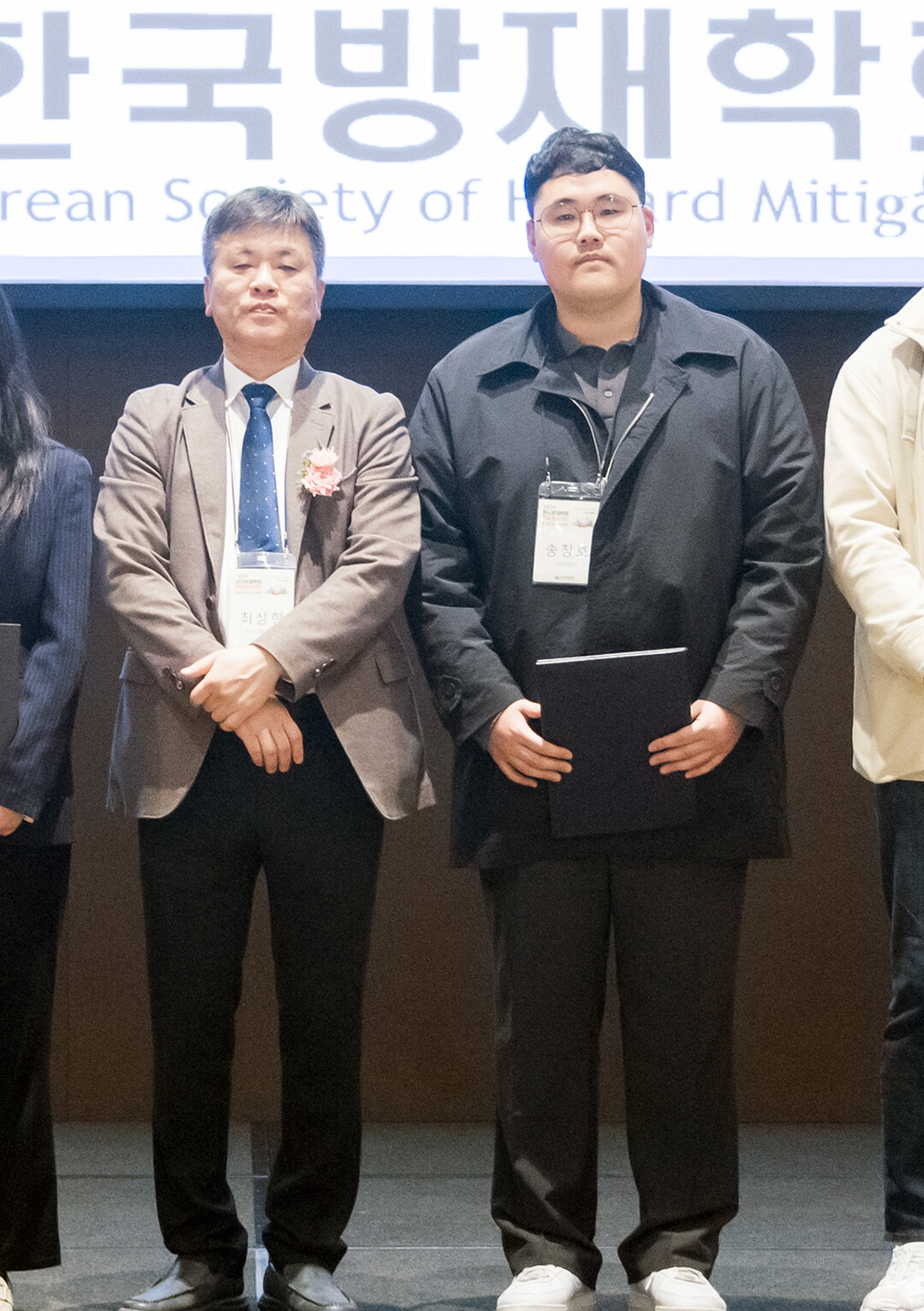 송창호 씨(오른쪽)가 상을 받고 최상현 한국방재학회장과 기념촬영하고 있다. 사진=국립부경대 제공 |