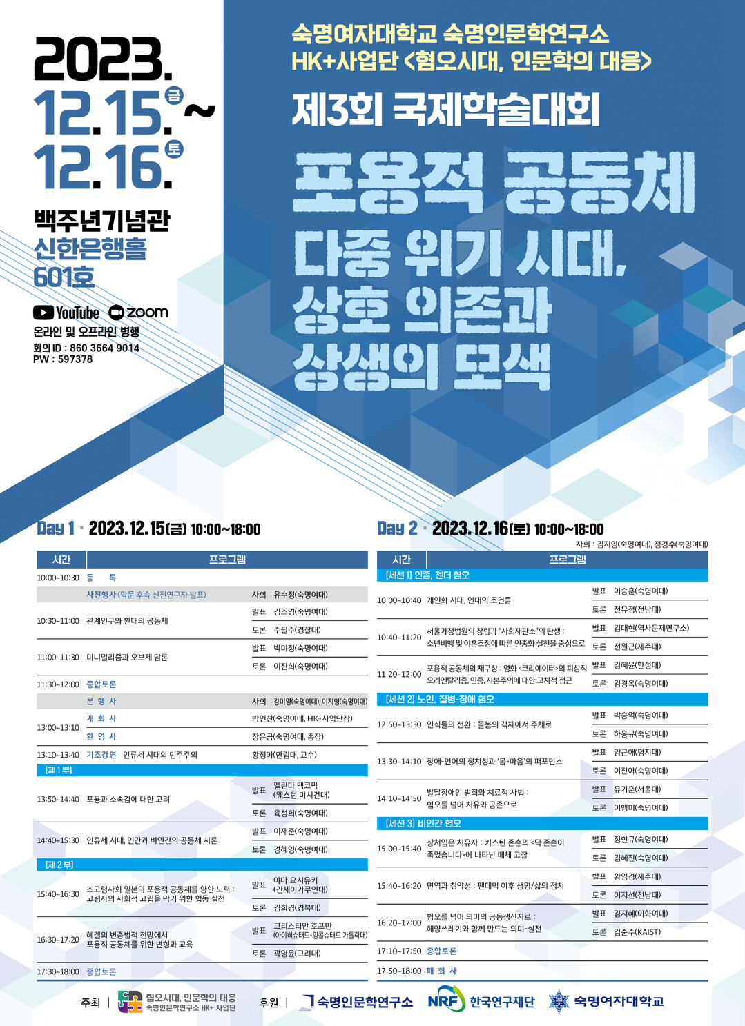 이번 학술대회는 숙명여대 백주년기념관 신한은행홀과 유튜브·줌에서 온오프라인 동시 개최한다. 별도 참여 신청 없이 누구나 자유롭게 참여할 수 있다.