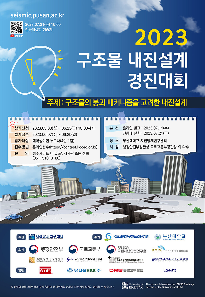 이상호 부산대 지진방재연구센터장은 “최근 튀르키예 대지진에서 알 수 있듯이 같은 국가 내에서도 내진설계 적용 여부에 따라 건물의 피해 규모에 큰 차이를 보였다”며 “이번 대회를 통해 구조물의 급격한 붕괴를 방지하고 올바른 건물 내진설계에 대한 참가자들의 참신한 아이디어가 많이 나오길 기대한다”고 밝혔다.