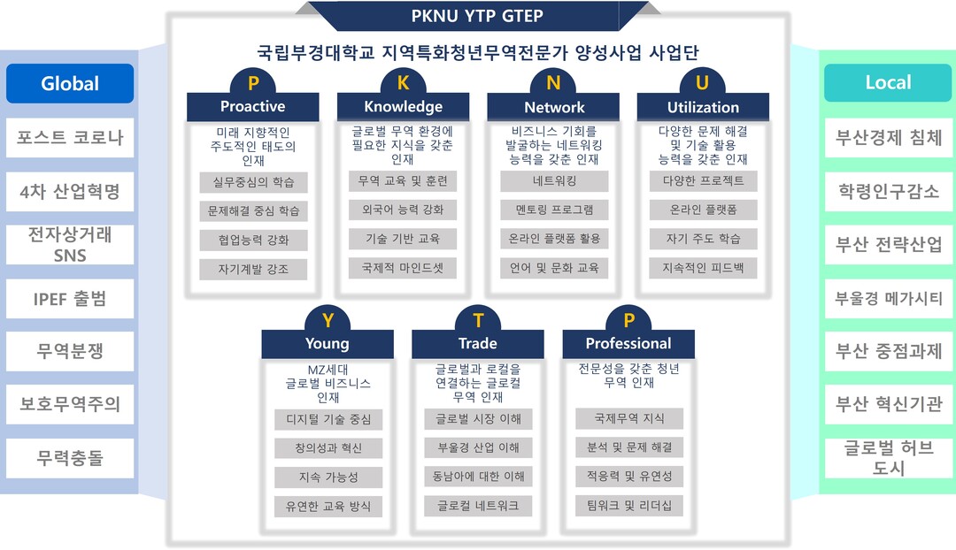 국립부경대 국제통상학부 PKNU YTP GTEP 사업단장 안태건 교수는 “우수한 학생들을 발굴해 동남아 지역 특화 교육은 물론 무역실무, 스마트물류 시뮬레이션, 전자상거래 플랫폼 활용 등 교육을 통해 글로벌과 로컬지역을 연결하는 청년 무역전문가를 양성할 계획”이라고 밝혔다.