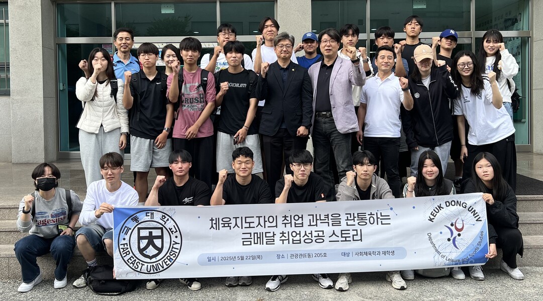 극동대 사회체육학과 재학생들이 지난 5월 22일 열린 ‘체육지도자의 취업 과녁을 관통하는 금메달 취업성공 스토리’ 특강을 마친 후 강연자 이천재 부회장 및 교수진과 함께 기념촬영을 하고 있다. 사진=극동대 제공 |