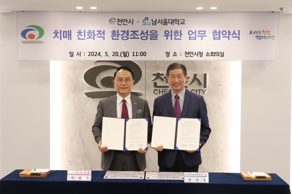 [대학저널 이선용 기자] 남서울대학교가 5월 20일 천안시청 회의실에서 천안시와 ‘치매 친화적 환경조성을 위한 업무 협약’을 체결했다.