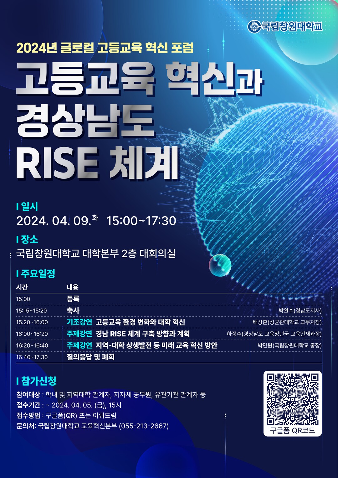이번 포럼은 국립창원대의 교육 혁신 의지를 담아 배상훈 성균관대 교무처장의 ‘고등교육 환경 변화와 대학 혁신’ 기조강연과 하정수 경상남도 교육청년국 교육인재과장의 ‘경남 RISE 체계 구축 방향과 계획’, 그리고 박민원 국립창원대 총장의 ’지역-대학 상생발전 등 미래 교육 혁신 방안‘ 주제강연으로 진행된다.