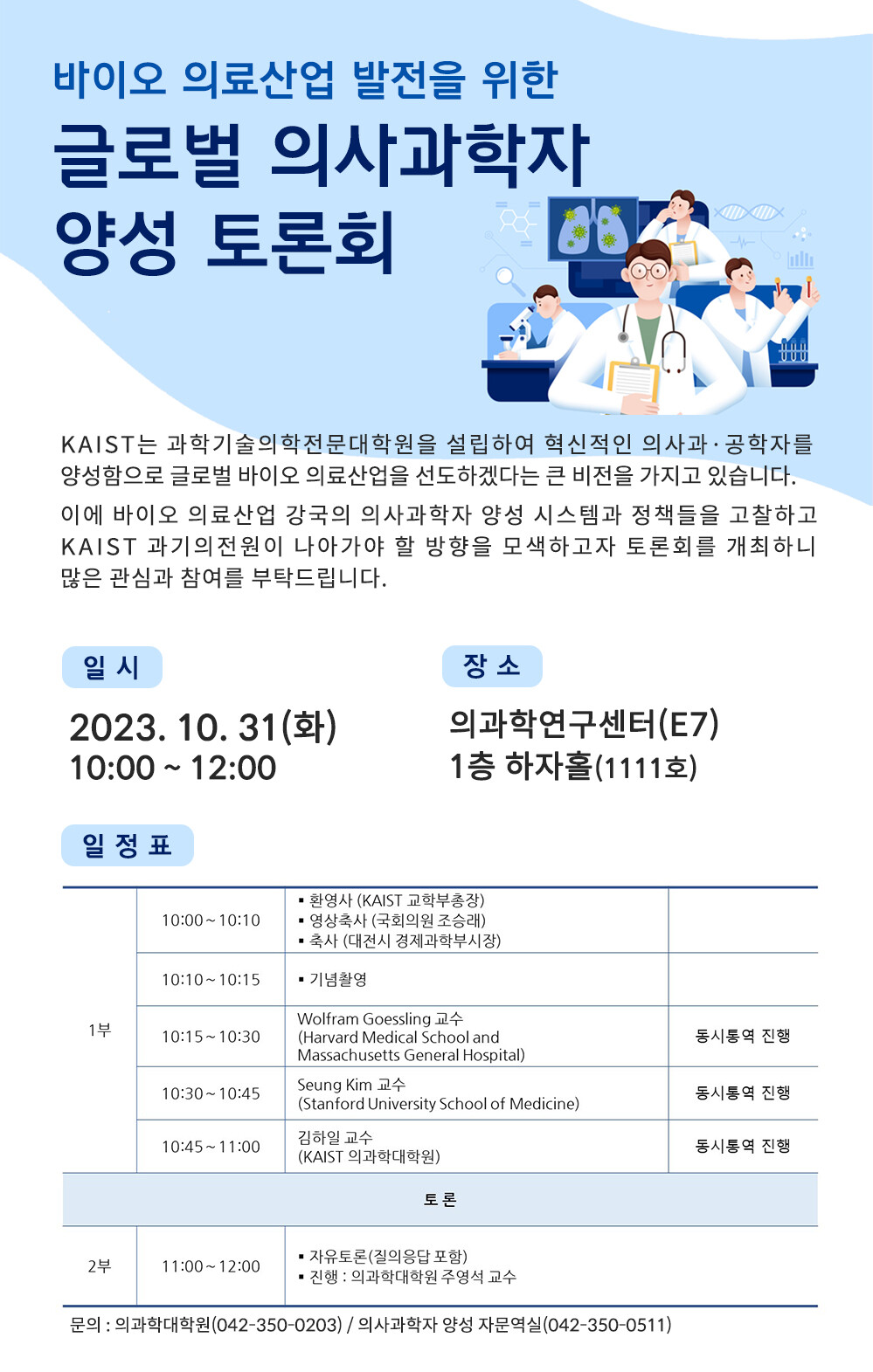 KAIST 의과학대학원이 주최하는 이번 토론회는 미국의 의사과학자 양성 시스템과 국가 정책을 살펴보고 이를 바탕으로 우리나라 의사과학자 양성 시스템의 선결 과제 및 해법을 모색하기 위해 마련됐다.
