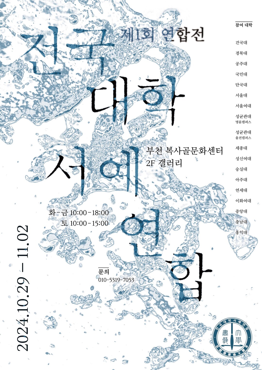 전국대학서예연합은 10월 29일부터 11월 2일까지 부천 복사골문화센터 갤러리에서 ‘전국대학서예연합 제1회 연합전’을 개최한다고 14일 밝혔다.