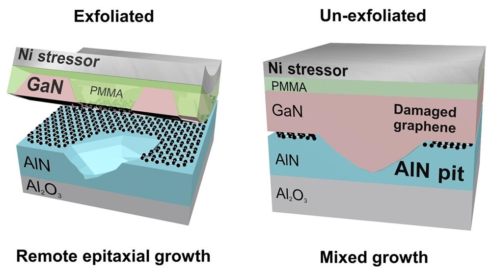 연구진은 질화갈륨과 유사한 특성을 갖는 질화알루미늄(AIN) 웨이퍼를 도입함으로써 금속 유기화학 기상증착 방식만으로 질화갈륨 박막을 성장시키고 박리시키는 원격 에피택시 기술을 구현하는데 성공했다.