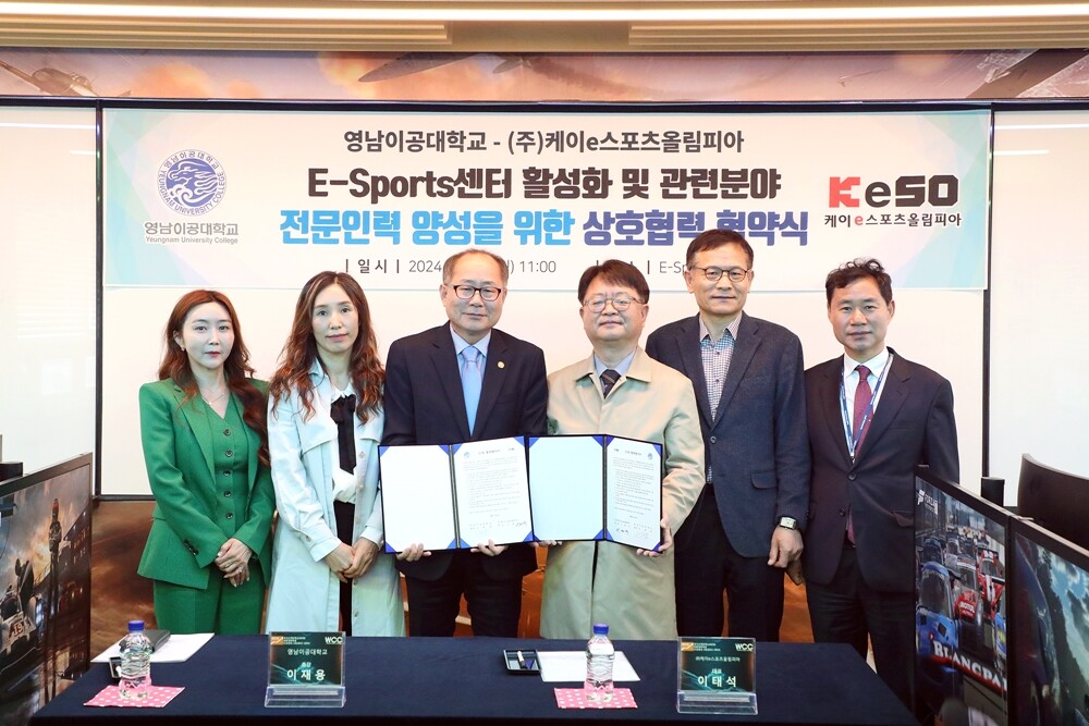 [대학저널 온종림 기자] 영남이공대학교가 8일 천마쉼터 E-스포츠센터에서 ㈜케이스포츠올림피아와 E-스포츠 활성화 및 관련 분야 전문인력 양성을 위한 업무협약을 체결했다.