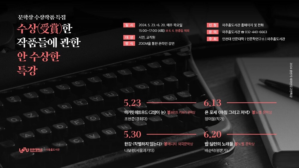 인천대 인문학연구소 오윤정 연구원은“세계적으로 권위 있는 문학상을 받은 다양한 장르의 작품을 전문가들과 함께 읽고 토론하는 시간을 통해 단순한 강독을 넘어 작품 속 이야기를 직접 체험해 보는 의미 있는 시간이 될 것”이라고 언급하며 관심 있는 시민과 학생의 많은 참여를 당부했다.