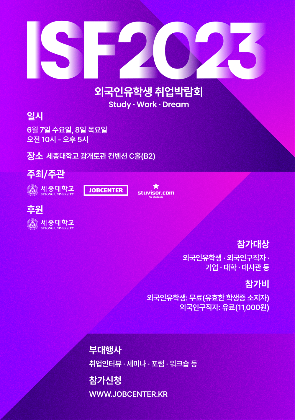세종대에 따르면 박람회는 20만명 외국인 유학생과 기업의 상생발전 및 외국인 유학생 고용을 통한 한국 기업의 글로벌 성장을 위해 기획됐으며, 국내 대학에 재학 중인 외국인 유학생이라면 누구나 JOBCENTER에서 무료로 참가 신청을 할 수 있다.