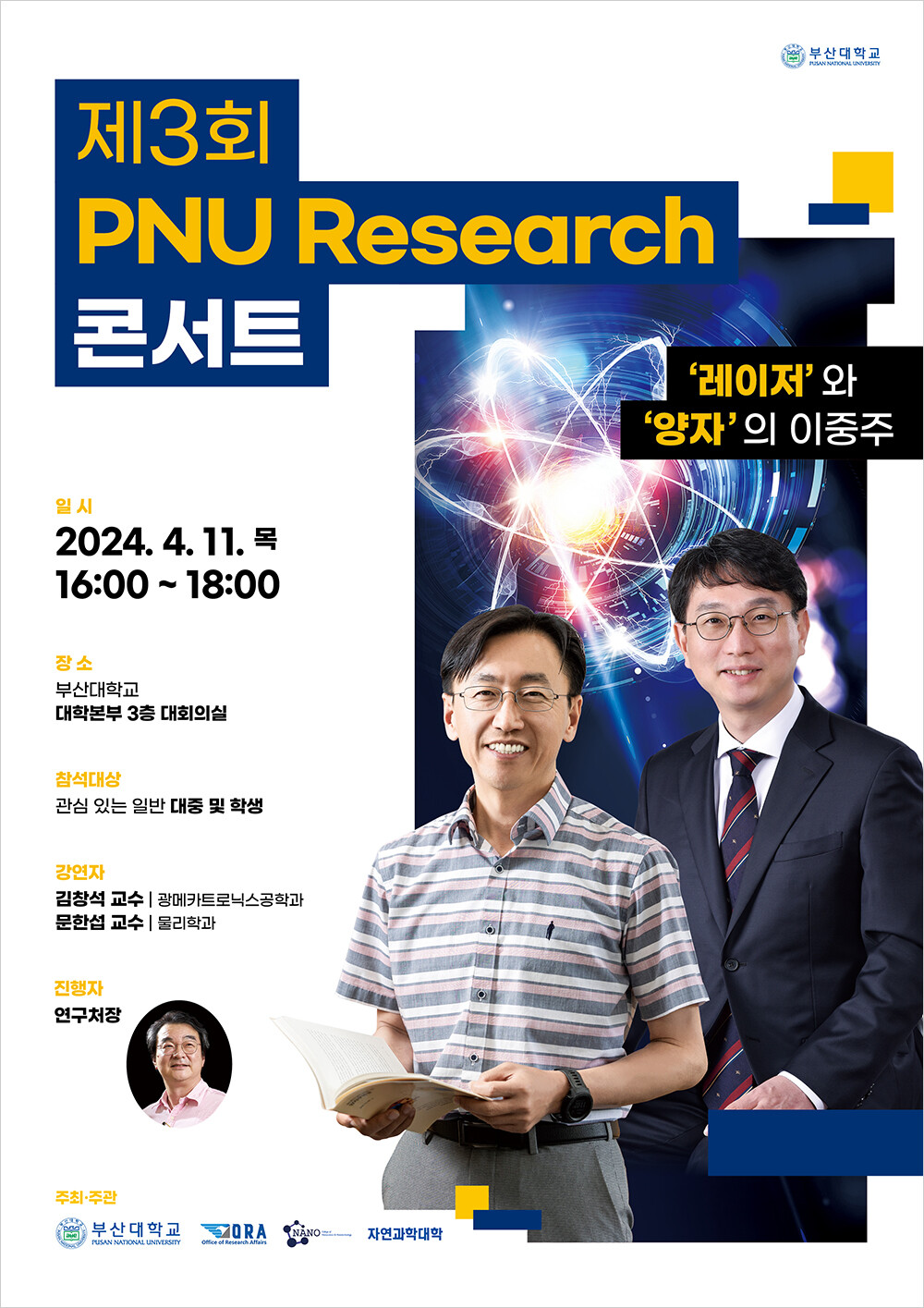 [대학저널 이선용 기자] 부산대학교 연구처는 탁월한 연구성과를 창출한 교내 연구자의 학술강연을 대중에게 제공하는 ‘제3회 PNU Research(리서치) 콘서트’를 오는 4월 11일 오후 4시부터 6시까지 대학본부 3층 대회의실에서 개최한다고 1일 밝혔다.