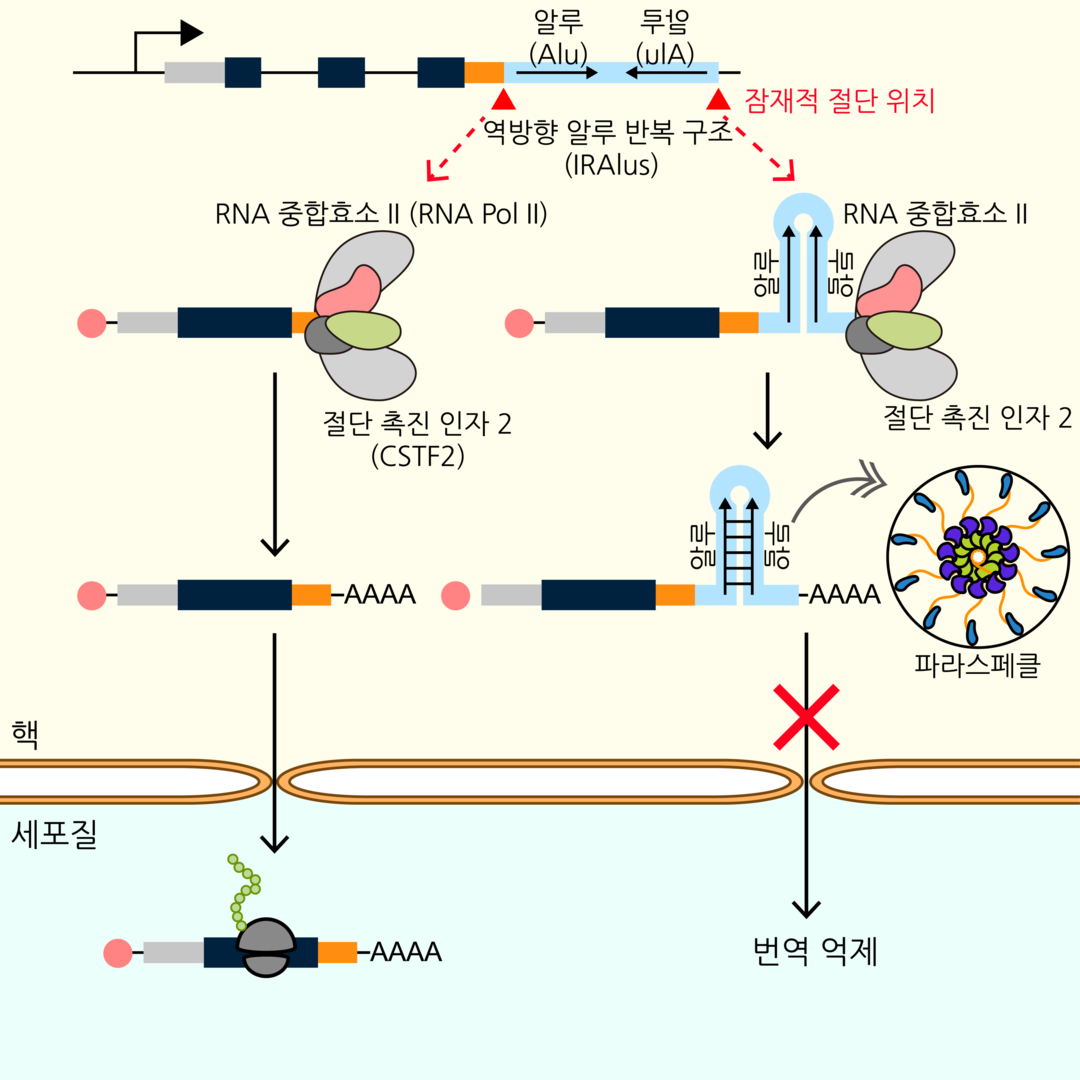알루(Alu)는 유전체의 단백질 정보를 가지고 있지만 유전체 상에서 본인의 서열만을 복제하는 성질이 있어 ‘이기적 서열’로 알려져 있었다. 최근 연구에 의하면 mRNA 내의 존재하는 역방향 알루 반복 구조(IRAlus)는 숙주 mRNA의 세포질로의 이동을 방해하여 해당 유전자의 단백질 번역을 억제한다. 그러나, 해당 유전자 발현 조절 기전의 생물학적 중요성에 대해서는 보고된 바가 없었다.