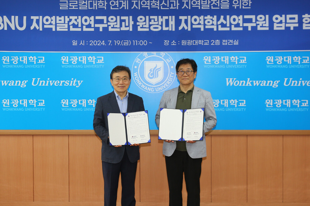 [대학저널 이선용 기자] 원광대학교 지역혁신연구원과 전북대학교 JBNU지역발전연구원이 글로컬대학30 사업의 성공적인 추진과 지역발전 전략 수립을 위한 업무협약을 체결했다.