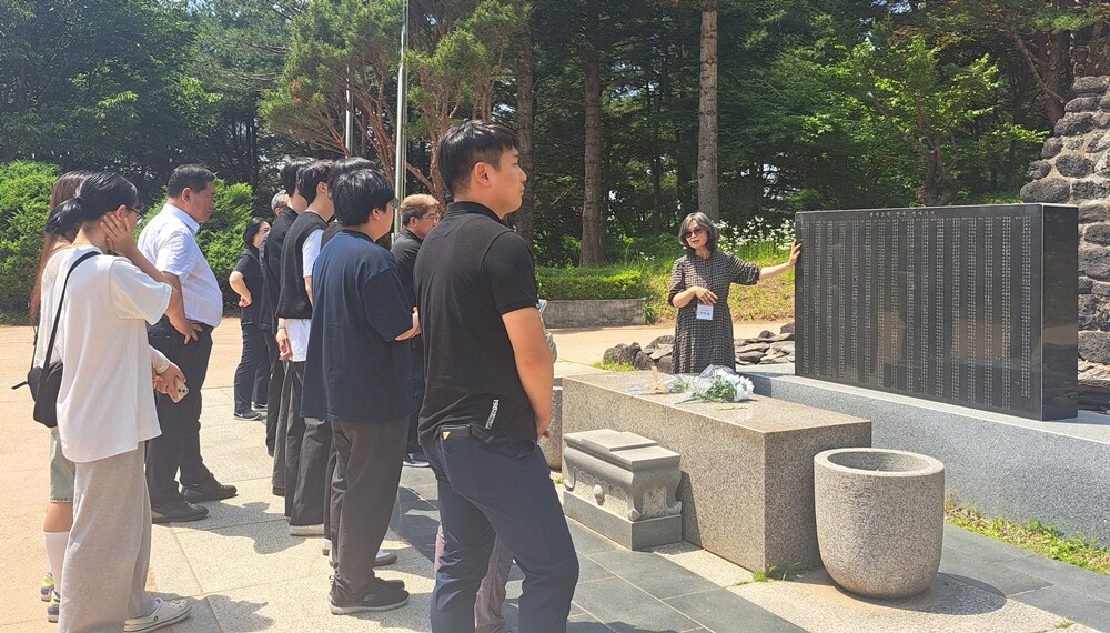 백마고지 전적비 앞에서 설명을 듣는 모습. 사진=한신대 제공 |